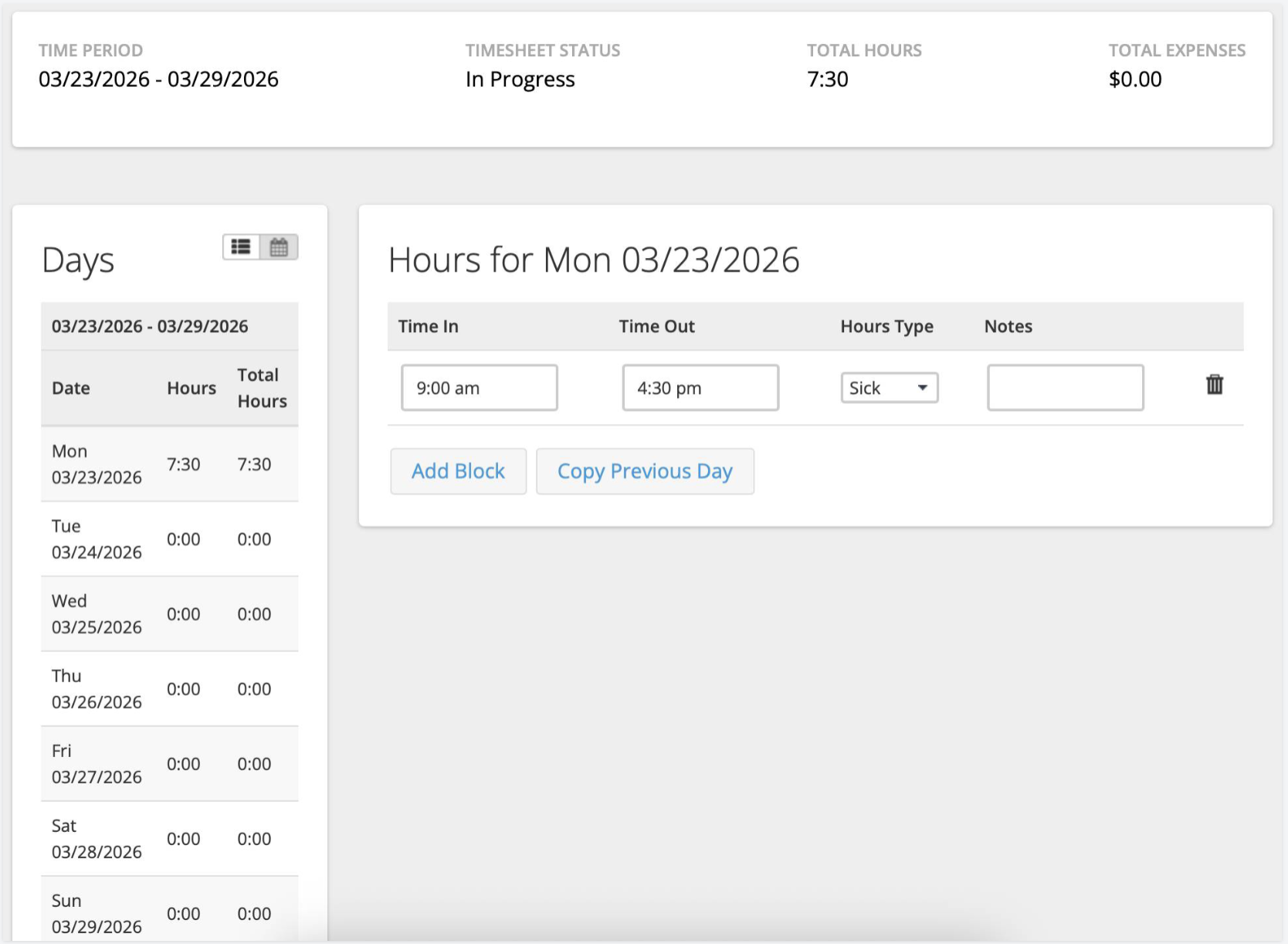 5. In the Time In and Time Out fields, enter the hours you were sick; select Add Block for each increment of time, along with the Hours Type: Sick.
