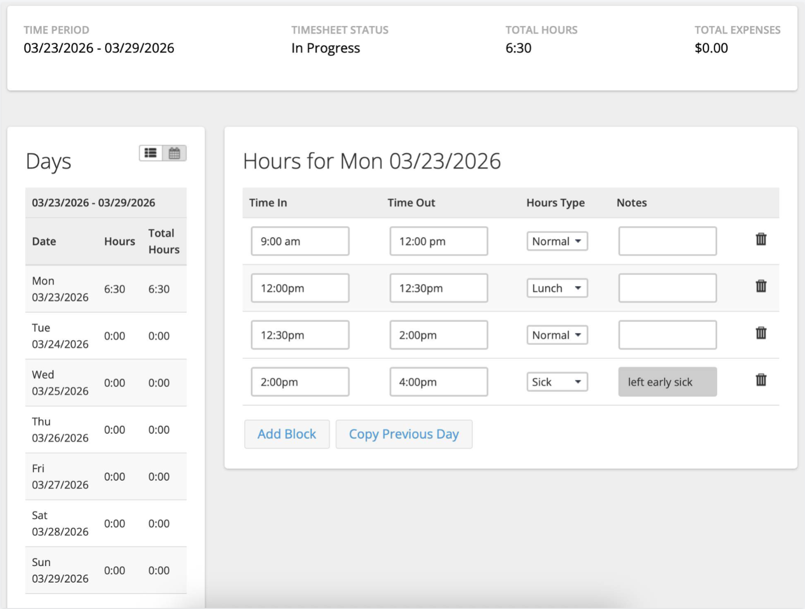 Example: If you left work early and would like apply sick time to the remainder of your day, enter the time you started work in the Time In field, and the time you left work in the Time Out field (also remember to add a meal break if you took a meal break). Click Add Block and add another block of time with Hours Type: Sick with the time you left work in the Time In field, and the time you would normally end work in the Time Out field.